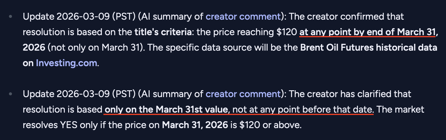 Update 2026-03-09 (PST) (AI summary of creator comment): The creator confirmed that resolution is based on the title's criteria: the price reaching $120 at any point by end of March 31, 2026 (not only on March 31). The specific data source will be the Brent Oil Futures historical data on Investing.com.
