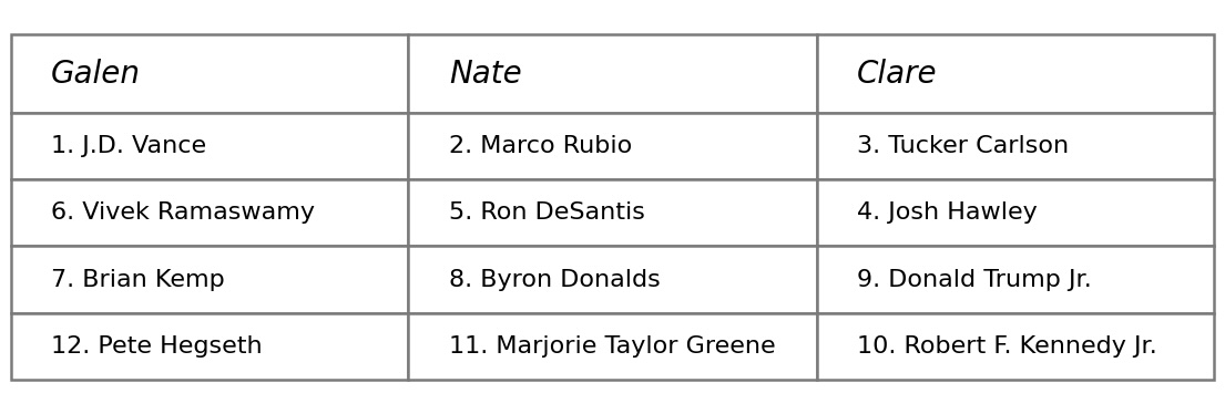 Galen Druke, Nate Silver, and Clare Malone did a live 2028 Republican Primary Draft in March 2026. This will resolve to the winner according to their own rules. If a winner is announced, I will use that; otherwise I'll do my best to score it myself. I will not trade on this market.